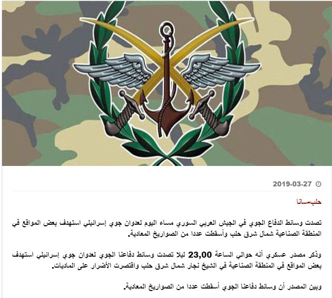 I militari siriani hanno comunicato di essere riusciti a distruggere molti dei missili nemici; tuttavia, hanno detto che un certo numero di altri ordigni hanno raggiunto gli obiettivi prefissati a Sheikh Najjar, Nayrab e nell’area aeroportuale di Aleppo.