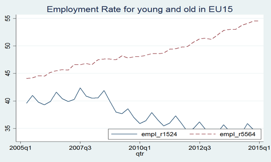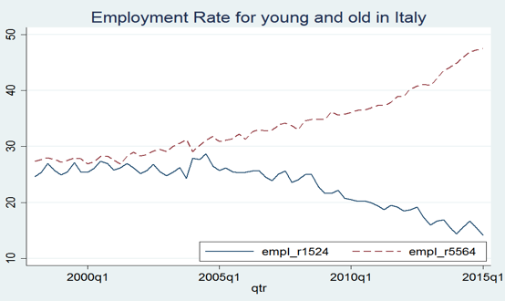 Il forte aumento della disoccupazione giovanile era stato previsto da una ricerca sul dualismo contrattuale (Saint-Paul 1993, Boeri 2011). Questa prevede che la disoccupazione giovanile reagirà in modo più accentuato alle fluttuazioni cicliche nei paesi caratterizzati da una forte protezione dell’occupazione nei contratti a tempo indeterminato unita alla possibilità di “licenziare a volontà” per i lavoratori a tempo determinato (Boeri et al 2015). Boeri e Garibaldi (2007) avevano previsto che il calo immediato della disoccupazione giovanile dopo le riforme del mercato del lavoro a due livelli, anche in scenari di crescita lenta, sarebbe stato seguito da disoccupazione giovanile al deteriorarsi delle condizioni macroeconomiche. La ricerca sul dualismo contrattuale, tuttavia, non spiega perché i tassi di occupazione abbiano avuto un andamento divergente tra giovani e anziani.