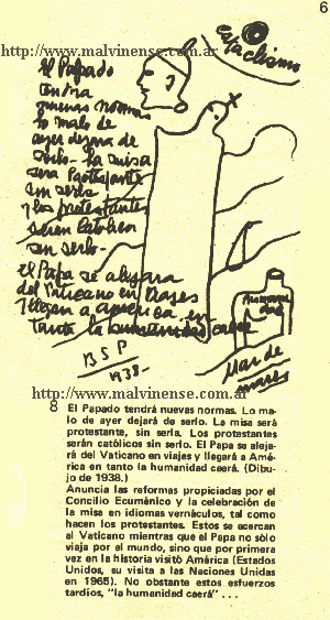 “Il Papato avrà nuove regole. Il male di ieri cesserà di essere tale. La messa sarà protestante senza essere protestante. I protestanti saranno cattolici senza essere cattolici. Il Papa lascerà il Vaticano in viaggio e verrà in America, mentre l’umanità cadrà”. (1938)