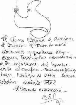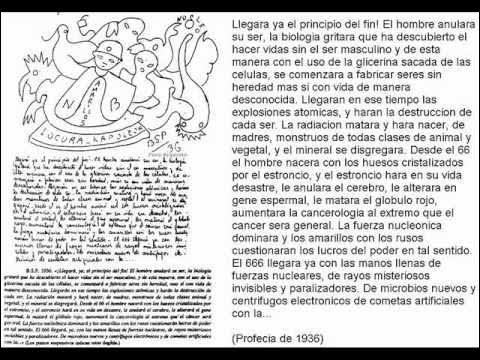 La forza nucleonica dominerà e i gialli con i russi metteranno in discussione i profitti del potere in questo senso. Il 666° arriverà già con le mani piene di forze nucleari di raggi misteriosi invisibili e paralizzanti. Di nuovi microbi di centrifughe elettroniche di comete artificiali con…” (1936)”L’uomo annullerà il suo essere, la biologia griderà che ha scoperto la fabbricazione della vita senza l’essere maschile, e così con l’uso della glicerina presa dalle cellule, inizierà a fabbricare esseri senza eredità, ma con la vita in modi sconosciuti. Le esplosioni atomiche arriveranno in quel momento e distruggeranno ogni essere, le radiazioni uccideranno e faranno nascere dalle madri mostri di ogni genere animale e vegetale, il minerale si disintegrerà.