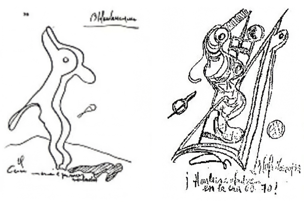 Dagli schizzi emerge la sua profonda spiritualità, e quello strano rapporto che lo legava agli “esseri dello spazio”, quegli “estranei”, come li definiva il poeta, o “esseri azzurri” provenienti dal pianeta Ki-En-Ki, che tenevano d’occhio la Terra già da migliaia di anni e sarebbero tornati su enormi navi rosse a forma di pesce. Secondo l’artista, gli stessi esseri avevano contribuito alla nascita di molte civiltà, tra cui quella sumera, quella egizia, quella greca e quella romana.