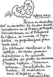 “Roma in disgrazia, la città ducale cade nel disastro. Ermetismo nei dintorni di Napoli. Disorientamento in Vaticano. La Chiesa sta affondando, il Papa se ne andrà, diventerà popolare ma sarà troppo tardi. Le riforme spaventeranno i cattolici. I giovani sacerdoti si confronteranno con le correnti di potere passivo che dominano. Nuova Chiesa. Nuove forme. Consigli in lotta. Domani sarà un ritorno alle catacombe”. (1938)
