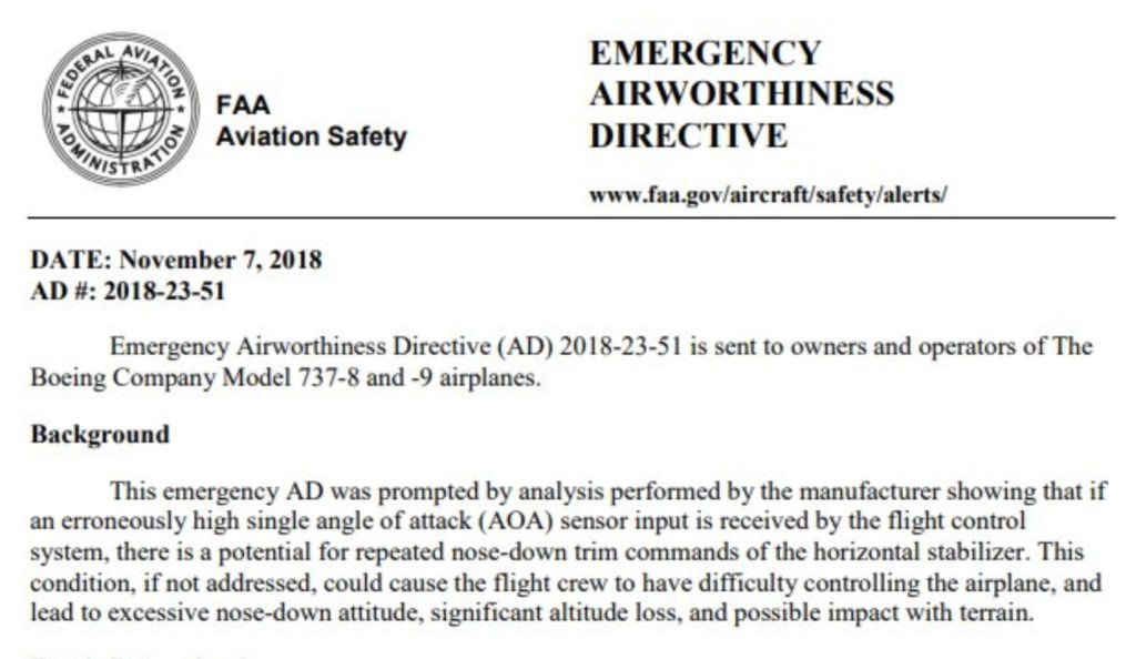 Nove giorni dopo che il volo indonesiano della Lion Air 610 si era concluso con un incidente mortale, la Federal Aviation Administration (FAA) aveva emesso una Emergency Airworthiness Directive [Direttiva di Emergenza di Aeronavigabilità].