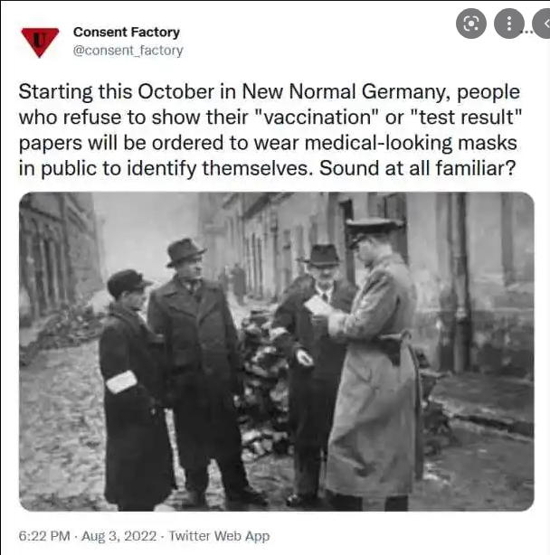 Sì, la Germania nazista e la Nuova Germania Normale sono due sistemi totalitari molto diversi, e ho delineato le loro differenze e somiglianze essenziali, ma, andiamo, non è così fottutamente difficile. Nella Germania nazista, gli ebrei erano i capri espiatori. Nella Germania New Normal, sono “i non vaccinati”.