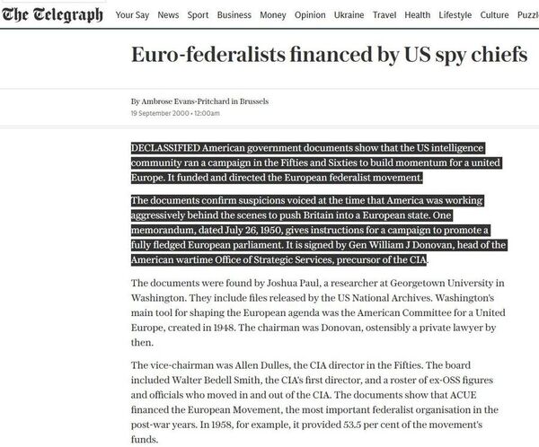 L’Unione Europea è fondamentalmente una versione socio-politica della NATO e, come la NATO, è stata un progetto dei governi americani dell’era della Guerra Fredda e della CIA. Negli anni ’50 e ’60, l’agenzia guidata da Allen Dulles spinse per la federalizzazione dell’Europa, apparentemente per “prevenire guerre future”, ma in realtà per consentire agli Stati Uniti di controllare meglio l’Europa occidentale ponendola sotto l’egida di un “superstato” centralizzato, completo di tutte le istituzioni dell’UE che conosciamo (e che in realtà non amiamo) oggi, e che sarebbe stato pienamente allineato con gli Stati Uniti.