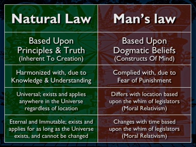 La Legge Naturale non è stata creata da uomini e donne e non può essere alterata, negata o elusa da nessun essere umano, autorità pretesa o Stato. Essa definisce la natura delle nostre interazioni e persino il modo in cui giudichiamo il nostro carattere.