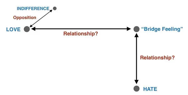 Se amore e odio non sono opposti, qual è la natura del loro rapporto? Come sono collegati? È possibile che non siano nemmeno collegati direttamente, ma piuttosto indirettamente, attraverso un sentimento intermedio che fa da ponte?