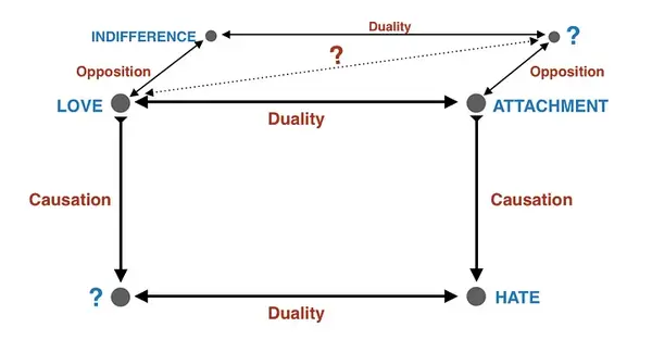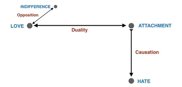 Di conseguenza, abbiamo potuto constatare che l’amore e l’odio sono collegati attraverso due relazioni (dualità e causalità) e il sentimento ponte dell’attaccamento.