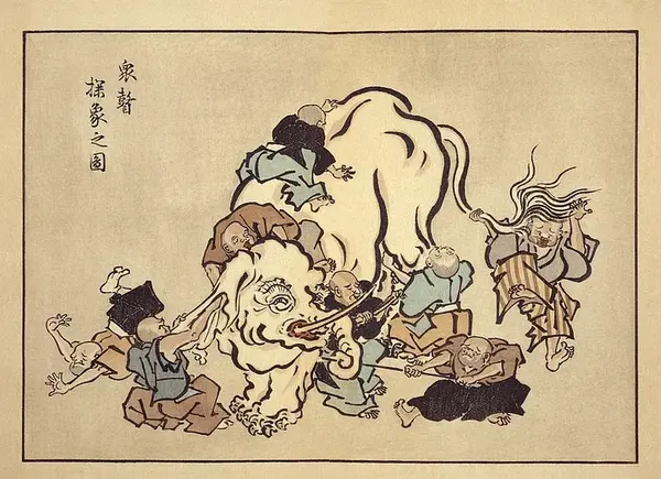 Uomini ciechi che esaminano un elefante del pittore, poeta e calligrafo giapponese Hanabusa Itchō (1652-1724), Pubblico dominio