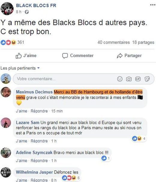 Giò abbiamo visto i black bloc, esattamente come a Genova nel luglio 2001, inserirsi nelle manifestazioni e saccheggiare e spaccare. Qui sotto, alcuni twitters di questi spaccatori mascherati in nero che si vantano delle loro devastazioni a Parigi, e ringraziano “i black Bloc di Amburgo e di Olanda” ed anche italiani. E’ come sempre la sinistra che fa il gioco del grande capitale.