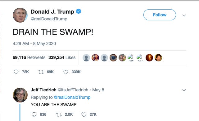 Nelle tre settimane precedenti le elezioni del 2016, ha twittato “Drain the swamp” (prosciugare la palude) 79 volte, di solito come hashtag, e ha twittato la parola “swamp” altre 75 volte nei quattro anni successivi a quelle elezioni.