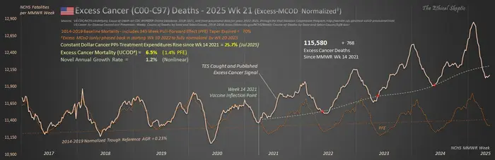 Questi dati aiutano a spiegare le 115.580 morti per cancro in eccesso registrate negli Stati Uniti dall’avvio della campagna di vaccinazione di massa con mRNA contro il COVID-19. L’analisi dei dati ufficiali del CDC effettuata da Ethical Skeptic rivela che la mortalità per cancro in eccesso continuerà a persistere nel 2025:
