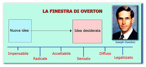 La cosiddetta “Finestra di Overton” (“The Overton Window”) è una vera e propria tecnologia di persuasione occulta delle masse. Stiamo parlando di “ingegneria sociale”, cioè di un modello di rappresentazione delle possibilità di cambiamenti nell’opinione pubblica.