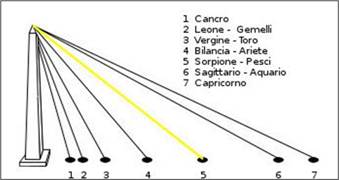 A mezzodì di ogni giorno il sole entra in un segno zodiacale e l’ombra prodotta dall’obelisco, che è analogo allo stilo della suddette meridiane che, nel nostro caso è definito gnomone, termina in un determinato disco zodiacale ed è il segno che vi corrisponde a segnalarlo. L’illustr. 10 mostra in particolare il caso che più interessa a noi per l’immagine della Dama e l’Unicorno dell’illustr. 9, ed è l’ombra prodotta quando il sole, al suo mezzodì, entra nei segni astronomici dei Pesci e dello Scorpione, cioè alle date degli equinozi.