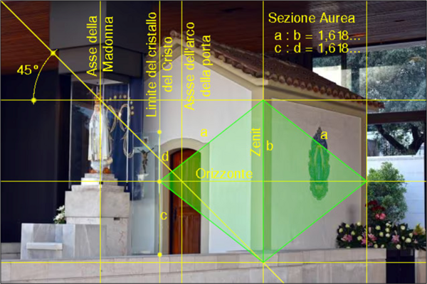 Perché in base all’indagine geometrica che mi è venuto in mente di fare, risulta conforme ad una struttura informata da regole geometriche in cui domina la Sezione Aurea. Si osservi la foto che segue per vedere questo insolito, più che pregevole, connubio geometrico con la Madonna.