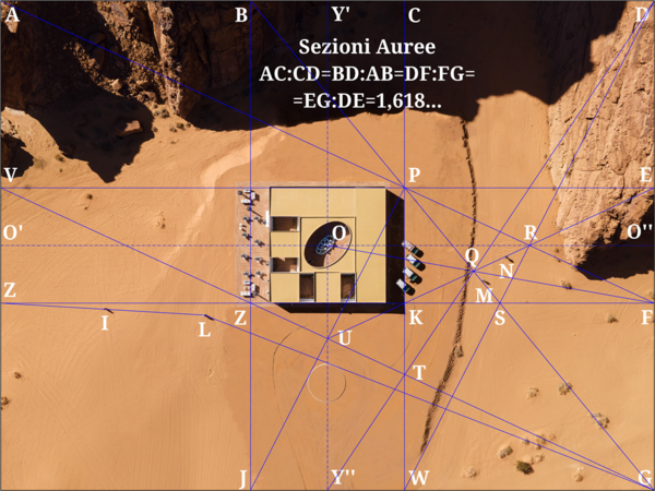 Il suddetto disegno dimostra la visione aurica della costruzione del Centro Visitatori senza disordini geometrici con la struttura del quadro fotografico. Non solo, ma anche le quattro persone I, L, M ed N vi sono comprese in questa straordinaria armonia.