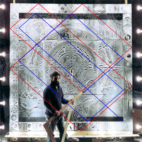 Risulta così che lo scultore, che si vede al centro della foto in questione, fa la parte di un fenomenale giocatore di biliardo e la sua enorme squadra di lavoro, diventa la stecca per giocare. E qui succede, come dire, il finimondo, nell’osservare due magici percorsi determinati dalla punta della stecca manovrata dallo scultore-giocatore, segnati con i colori rosso e blu. Insomma si ha modo di ammirare estasiati, in due fasi indipendenti fra loro, un funambolico gioco di sponda nel doppio quadrato della meridiana.
