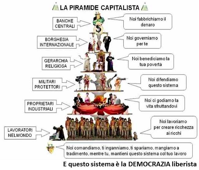“Il capitale deve proteggersi in ogni modo possibile con alleanze e legislazione. I debiti devono essere riscossi, le obbligazioni e i contratti ipotecari devono esser conclusi in anticipo e il più rapidamente possibile. Quando, mediante processi giuridici, le persone comuni perderanno le proprie case, diventeranno sempre più docili e saranno tenute a freno con più facilità attraverso il braccio forte del governo al potere, azionato da una forza centrale di ricchezza sotto il controllo di finanzieri di primo piano. Questa verità è ben conosciuta tra i nostri uomini di spicco, adesso impegnati nel costituire un imperialismo del Capitale che governi il mondo.Dividendo gli elettori attraverso il sistema dei partiti politici, possiamo fare spendere le loro energie per lottare su questioni insignificanti. Di conseguenza, con un’azione prudente abbiamo la possibilità di assicurarci quello che è stato pianificato così bene e portato a termine con tanto successo.”USA Banker’s Magazine (Rivista dei banchieri americani), 25 Agosto 1924