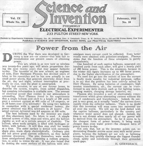Quest’arte, che è nuova oggi come lo era il wireless venticinque anni fa, nei prossimi vent’anni raggiungerà proporzioni che oggi possono sembrare fantastiche. L’inventore di questa nuova scienza, un ingegnere di spicco, Herr Hermann Plauson, ha dedicato anni di lavoro alle sue ricerche e ora ha messo in funzione piccole centrali elettriche che generano elettricità direttamente dall’aria, giorno e notte, senza interruzioni e praticamente a costo zero, una volta costruito l’impianto.