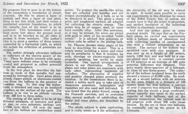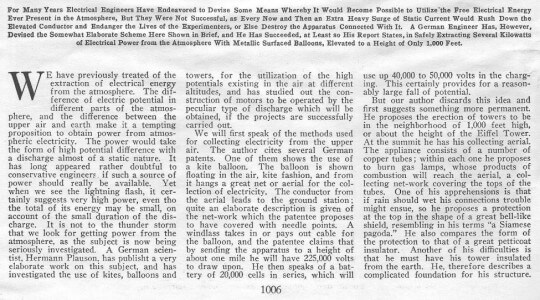 Agli ingegneri conservatori è apparso a lungo piuttosto dubbio se una tale fonte di energia fosse davvero disponibile. Tuttavia, quando vediamo il lampo, questo suggerisce certamente una potenza molto elevata, anche se l’energia totale può essere piccola, a causa della durata ridotta della scarica. Non è al temporale che ci rivolgiamo per ottenere energia dall’atmosfera, perché l’argomento è ora oggetto di un serio studio. Uno scienziato tedesco, Hermann Plauson, ha pubblicato un’opera molto elaborata su questo argomento e ha studiato l’uso di aquiloni, palloni e torri, per l’utilizzo degli alti potenziali esistenti nell’aria a diverse altitudini, e ha studiato la costruzione di motori da far funzionare con il particolare tipo di scarica che si otterrà, se i progetti saranno realizzati con successo.