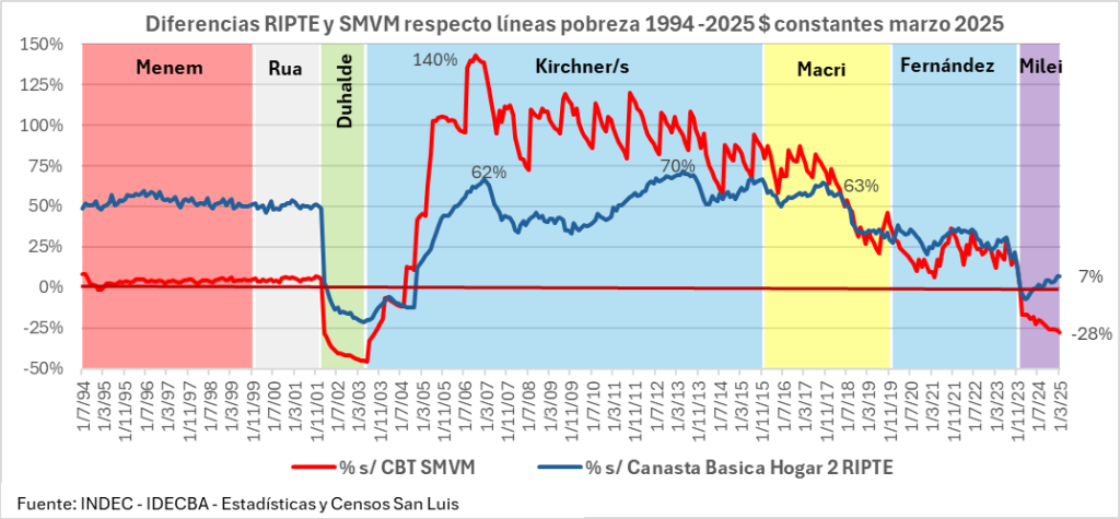 Sotto Macri si è mantenuto un differenziale tra i due indicatori fino a 800 dollari, che ha iniziato a ridursi rapidamente nel 2017, con la ricomparsa del FMI, scendendo a circa 400.000 dollari sotto Fernández. E poi nei primi mesi di Milei, il RIPTE è di nuovo momentaneamente precipitato al di sotto del paniere domestico di tipo 2, per attestarsi attualmente nel marzo 2025 a 90 mila dollari al di sopra di esso. Con un differenziale storico minimo, i cui dettagli negativi sono illustrati di seguito.