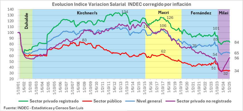 Si può notare che da un indice di 100 nell’ottobre 2001, con la caduta della convertibilità, il salario nel settore privato registrato (linea verde) è sceso verso la fine del governo Duhalde meno -30%, poi con i Kirchner/s ha raggiunto un picco di 134, con Macri 126; con Fernández alla fine 100, pari a quello della convertibilità, e con Milei meno 84. Questo rappresenta un calo di meno -38% dal picco di Kirchner/s, meno -33% o un terzo in meno del picco di Macri, e meno -16% dal picco di Fernández. Questo rappresenta un calo di meno -38% rispetto al picco di Kirchner/i, meno -33% o un terzo in meno rispetto al picco di Macri, e meno -16% rispetto al picco di Fernández.