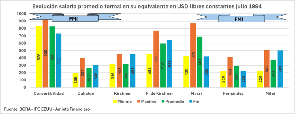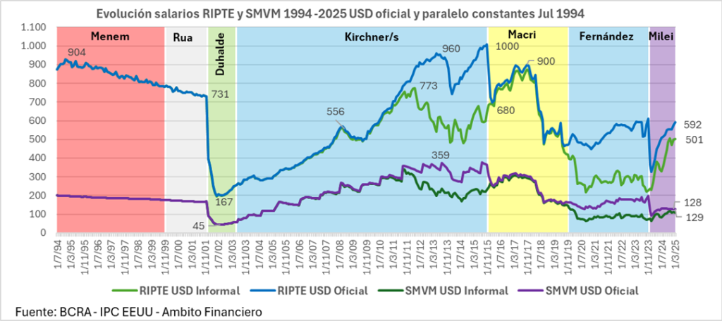 Come sintesi di questa analisi, nel seguente grafico comparativo tra Minimo, Massimo, Media e Fine di ciascun governo, si può notare che la media del RIPTE equivaleva a 826 dollari liberi durante la convertibilità, 267 dollari liberi sotto Duhalde, 314 dollari liberi sotto Kirchner, 595 dollari liberi sotto Fernández de Kirchner.durante la convertibilità, 267 dollari liberi sotto Duhalde, 314 dollari liberi sotto Kirchner, 595 dollari liberi sotto Fernández de Kirchner, 691 dollari liberi sotto Macri, 288 dollari liberi sotto Fernández e solo 375 dollari liberi sotto Milei.