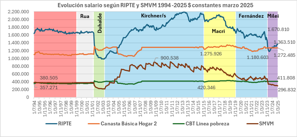 Il RIPTE (Remuneración Imponible Promedio de los Trabajadores Estables) dà un’idea dell’evoluzione del salario medio dei lavoratori formalizzati. Si può notare che il suo parametro principale, la media di ogni governo, come si può vedere qui sotto, è passata da 1,69 dollari in milioni durante la convertibilità, a 1,14 dollari sotto Duhalde, a 1,64 dollari sotto Kirchner, a 1,96 dollari sotto Fernández de Kirchner e a 1,95 dollari sotto Macri. Da lì è crollato con la ricomparsa del FMI nel 2018, a 1,61 dollari sotto Fernández e a 1,28 dollari sotto Milei, tornando così quasi al livello di Duhalde.