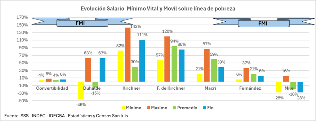 Per quanto riguarda il SMVM, dall’equivalente di 200 dollari all’inizio della convertibilità, è sceso a 167 dollari verso la fine della stessa, per poi crollare a 45 dollari durante la transizione di Duhalde. Poi è gradualmente risalito a 350 dollari nel 2011 sotto i Kirchner, prima di scendere a 300 dollari con il cepo e il dollaro parallelo o informale o libero.