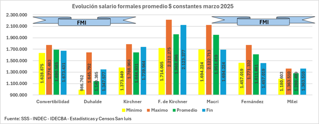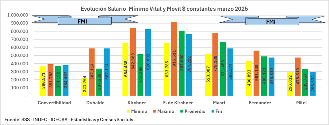 Di seguito ne è riportata una sintesi, con grafici successivi che mostrano gli importi corrispondenti al Minimo, al Massimo, alla Media e alla Fine di ogni governo, che a sua volta è l’inizio del suo successore, da luglio 1994 a marzo 2025, in pesos costanti di quest’ultimo mese, la cui storia mensile è sviluppata di seguito.
