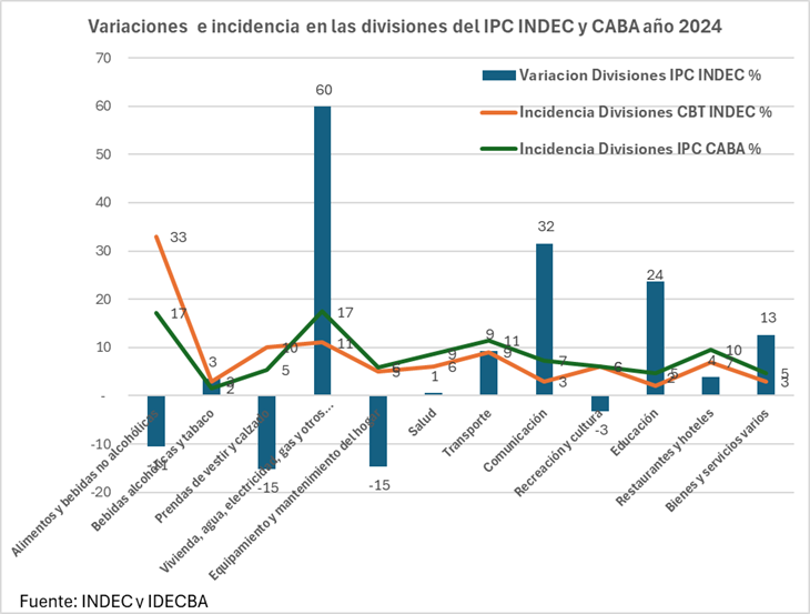Due aspetti sono degni di nota. In primo luogo, gli enormi aumenti del livello generale registrati dalle divisioni o voci Abitazione, Comunicazione, Istruzione, Beni e Servizi. Allo stesso tempo, queste hanno una bassa incidenza percentuale nel calcolo, se confrontate con l’IPC CABA. Dall’altro lato, l’alta incidenza nel calcolo delle divisioni che hanno diminuito il loro aumento rispetto al livello generale dell’INDEC, come Alimentari, Abbigliamento, Attrezzature, Ricreazione e cultura, ecc.