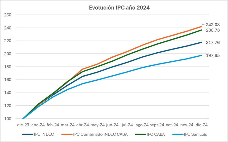 Per questo motivo, è stato effettuato un ricalcolo dei valori del CPI INDEC, prendendo a tal fine le incidenze delle diverse divisioni dal CPI CABA. Il risultato per l’anno cruciale 2024 è una variazione del 142% in questo indice combinato, contro il 136% del CABA CPI e il 117% dell’INDEC CPI. Come si può vedere nel seguente grafico comparativo, che include anche il CPI della provincia di San Luis, che ha prodotto un valore del 197%.