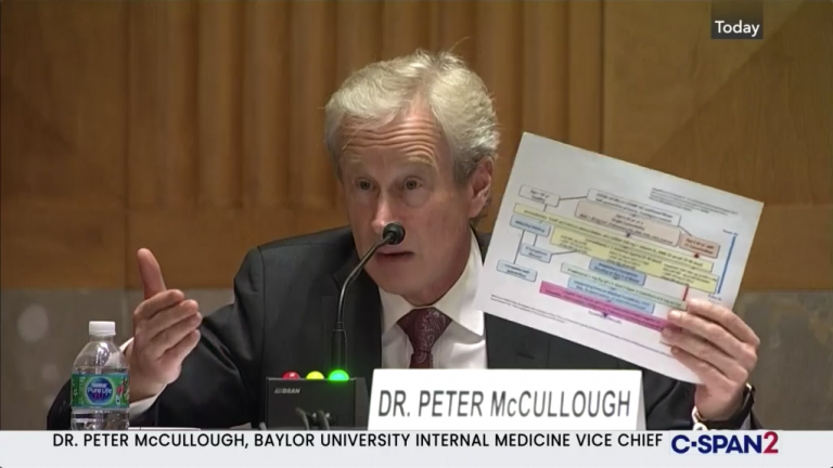 McCullough ha spiegato che all’inizio, come medico che curava i pazienti di COVID, ha elaborato un regime di trattamento precoce per quelli colpiti dal virus, che ha ridotto i ricoveri ospedalieri di circa l’85%, e ha detto che ha iniziato a pubblicare articoli su ciò che aveva imparato. Il medico ha notato che è stato “incontrato con resistenza a tutti i livelli” in termini di trattamento effettivo dei pazienti e pubblicazione dei suoi articoli.