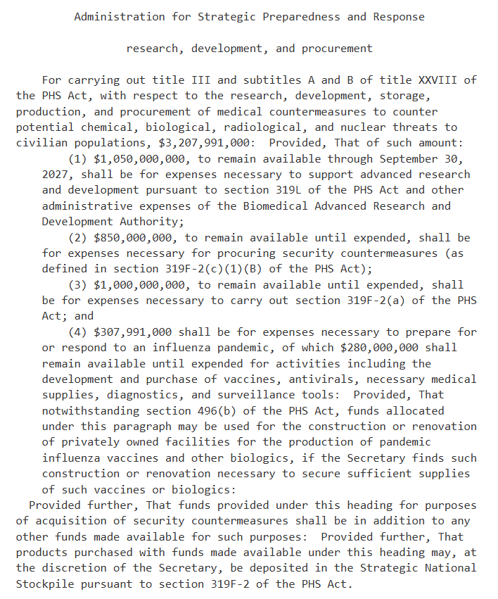 “Per l’attuazione del titolo III e dei sottotitoli A e B del titolo XXVIII della legge PHS, in relazione alla ricerca, allo sviluppo, allo stoccaggio, alla produzione e all’approvvigionamento di contromisure mediche volte a contrastare potenziali minacce chimiche, biologiche, radiologiche e nucleari alla popolazione civile, 3.207.991.000 dollari: a condizione che di tale importo”