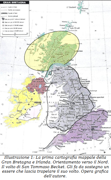Nel volto d’uomo della Cartografia Mappale della Gran Bretagna e Irlanda, non ho avuto dubbi di intravedervi Tommaso Becket, (illustr. 2) Lord Cancelliere del Regno d’Inghilterra dal 1154, eletto arcivescovo di Canterbury e primate d’Inghilterra nel 1162. Ostile ai propositi di Enrico II di ridimensionamento dei privilegi ecclesiastici, venne ucciso (forse per ordine del sovrano) il 29 dicembre 1170. Nel febbraio 1173 venne proclamato santo e ascritto nel catalogo dei martiri da papa Alessandro III durante un soggiorno dello stesso a Segni nei pressi di Anagni, però, è molto eloquente nel far capire che parte faccia l’angelo. In realtà il presunto spirito angelico, da come si svolgono le parti dello scenario in osservazione, mostra di sé un comportamento chiaramente “intimo” con la donna che, per contro sembra ricambiare con la gioia del volto, questa palese manifestazione d’amore