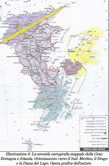 Senza dubbio da parte mia, la configurazione mostrata nell’illustr. 3, che ho eseguito senza difficoltà, si confà alle leggende e miti riportati dalla letteratura del XIII secolo. Se ci si attiene alla cartografia ora in mostra, assume consistenza il mito di Merlino e la Dama del Lago e con loro si frappone il noto drago dei racconti sul loro conto.