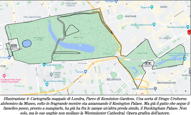 Ma ha già fra le zampe una preda, il Buckingham Palace. Non solo, ma le sue unghie non mollano la Westminster Cathedral. Riflettendo si ripete la stessa cosa della lepre e il riccio, quasi un cagnolino esaminato all’inizio con la cartografia mappale dell’illustr. 1. E allora i due animali, uno acquatico e l’altro terrestre, anche questi interpretati in altro modo, potrebbero rappresentare anche il fosco Drago dell’illustr. 3 che cavalca la Dama del Lago e la loro forza e potere è tutta legata al Kensington Palace, e al Buckingham Palace, non senza l’altro potere, quello religioso segnato dalla Westminster Cathedral. Di qui una chiara allusione alla Regina Elisabetta II che è anche il capo della Chiesa anglicana