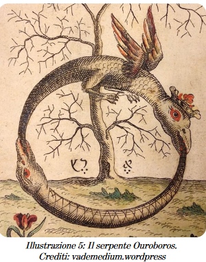 «L’Uroboro (dal greco οὐροβόρος, dove οὐρά, urà, sta per “coda” e βορός, boròs, sta per “mordace”, aggettivo riferito al serpente) è l’immagine di un serpente che si morde la coda e la inghiotte. Questa diffusissima figura simbolica rappresenta, sotto forma animalesca, l’immagine del cerchio personificante l’eterno ritorno.