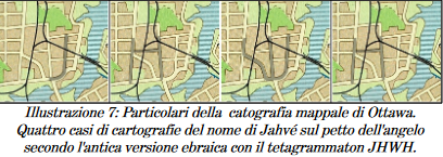 E c’è di più perché, se la lettera G posta sul petto del presunto arcangelo, in apparenza può indicare il nome Gabriele, da un lato mettiamo , dalla disposizione urbana della mappa locale, dall’altro lato, si può benissimo leggere un altro nome, quello di Jahvé composto come si conviene dai testi ebraici su di lui, ossia JHWH (illustr. 7). Ma è vero pure che JHWH è chiamato Geova dai Testimoni di Geova, il movimento religioso cristiano, originalmente