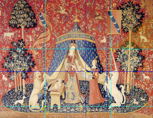 Tutto ha inizio con la predisposizione dell’arazzo “A’ mon seul désir” con la precisa collocazione geometrica dell’Unicorno e del Leone in base alla nuova fig. 2 di seguito mostrata.