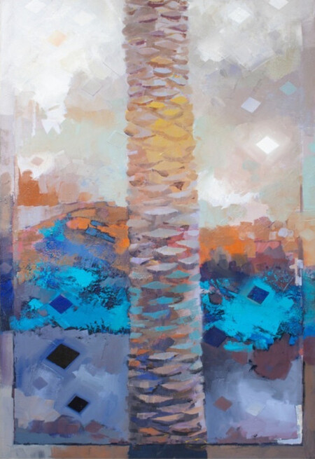 L’artista Abdul Qader Al Rais degli Emirati Arabi Uniti si è fatto fotografare accanto ad una palma, ma contrasta vedere tante finestre con inferriate verticali e due porte, una chiusa e l’altra aperta con una piccola entrata. Sembra di trovarsi davanti a un carcere, ma Abdul Qader Al Rais mostra un aspetto enigmatico, li presente, come se non volesse parlare, è come se facesse parlare la palma che gli sta accanto, ha la sua parola e qualcosa si scopre per farci capire. Infatti l’artista la ritrae con il dipinto It Stands Still Series, 2020 che mostro di seguito: