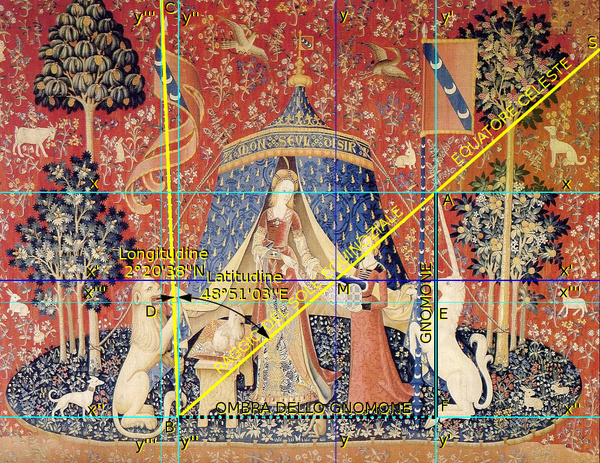 Il caso, beffandosi della logica umana per l’interpretazione di questa opera d’arte, si è servito della scienza matematica, la geometria gnomonica del tutto estranea a questa degli arazzi, per tradurre con segni grafici la risposta tramite coordinate geografiche del luogo esatto del Museo dell’Hotel Cluny di Parigi dove è esposta nelle diverse versioni la Dama per essere visitata da ammiratori di tutto il mondo.