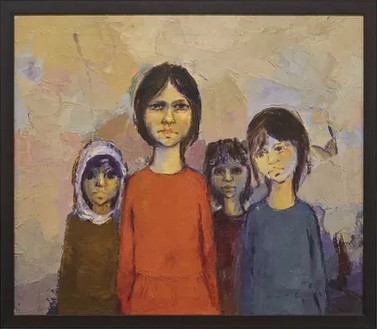 Abdul Qader Al Rais fa il quadro della donna con quattro ragazze di cui una, la più grande sembra parlare con accusa. L’altra, sulla sua sinistra è in sovrapensiero ma è altrettanto accusatrice. La cornice nera dipinta del quadro denuncia quasi un cattivo rituale. Il dipinto si intitola Waiting (circa) 1970.