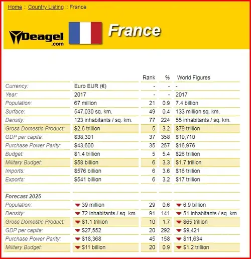 No, questi sono bravi ragazzi, che attingono alle loro fonti: “La maggior parte dei dati economici e demografici utilizzati nelle previsioni sono ampiamente disponibili presso istituzioni come la CIA, il FMI, l’ONU, il governo degli Stati Uniti e così via”. E continua: “Una piccola parte dei dati proviene da varie fonti fantasma come guru di Internet, rapporti non firmati e simili. Ma tutte queste fonti provengono da Internet e sono di dominio pubblico” E, giudiziosamente, quando nessuno ha chiesto nulla, i redattori ci ricordano che le loro previsioni non includono guerre o pandemie “A proposito, nessuna pandemia o guerra nucleare è inclusa nelle previsioni”. “Non scherziamo… La popolazione mondiale diminuirà drasticamente e tragicamente (ricordiamo che la loro tabella mostra che tra il 2017 e il 2025 la Francia perderà 28 milioni dei suoi 67 milioni di abitanti…), cioè poco più del doppio della sua popolazione.