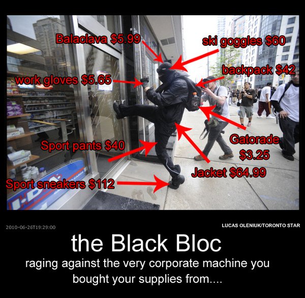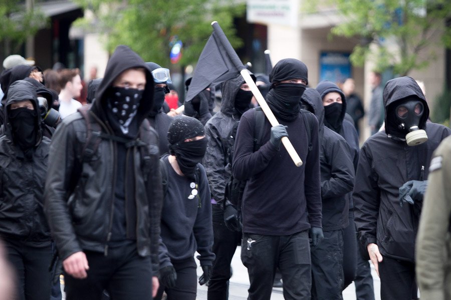 Si tratta dei “famigerati” Black Bloc, piccoli gruppi di giovani vestiti di nero e con il volto coperto che una volta infiltratisi nelle manifestazioni, con tattiche paramilitari di guerriglia urbana spaccano le vetrine, danneggiano le auto, devastano i negozi e appiccano il fuoco, praticando atti di puro teppismo, per poi sparire regolarmente nel nulla prima che le forze dell’ordine abbiano modo di venire a contatto con loro…..