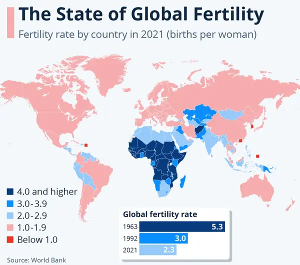 La fertilità è ormai al di sotto della soglia di sostituzione in quasi tutta l’America Latina e l’Asia orientale. E metà del Medio Oriente, compresi Turchia e Iran, non ha abbastanza figli per sostenere la propria popolazione.