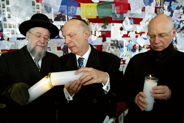 Klaus Schwab (a destra) e il rabbino Arthur Schneier (al centro) accendono le candele a Ground Zero il 3 febbraio 2002.