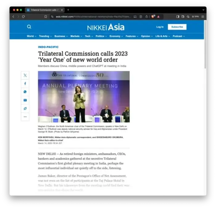L’intelligenza artificiale è entrata nel gioco dei globalisti. Alla riunione annuale della Commissione Trilaterale del 2023, in cui un oratore senza nome ha dichiarato che il 2023 sarà “l’anno uno di questo nuovo ordine globale”, i partecipanti hanno chiesto a ChatGPT di creare una poesia sull’organizzazione. Di seguito è riportata una delle voci:
