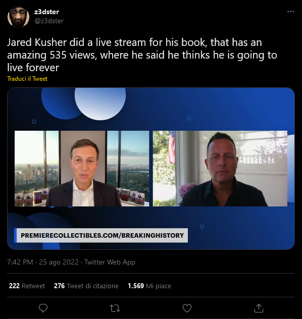 Jared Kushner non aveva ancora letto la notizia, molto probabilmente. Stava solo dicendo a un intervistatore che sta lavorando per diventare più sano perché la sua generazione sarà probabilmente la prima a “vivere per sempre” o “l’ultima generazione che morirà”. Perciò dobbiamo “mantenerci in buona forma”.
