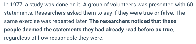 L’assai poco descrittivo termine ‘effetto- verità illusorio’ descrive il modo in cui le persone, con tutta probabilità, saranno indotte a credere alla veridicità di una qualsiasi affermazione dopo averla sentita ripetere molte volte. Questo è dovuto al fatto che la sensazione di familiarità che proviamo quando ascoltiamo qualcosa che abbiamo già sentito in precedenza è molto simile alla nostra esperienza del sapere che una certa cosa è vera. Quando ci troviamo di fronte a qualcosa di conosciuto, questa familiarità ci dà quella che viene definita “facilitazione cognitiva”, quello stato di rilassatezza e di tranquillità che proviamo quando le nostre capacità mentali non vengono impegnate a fondo. Sperimentiamo la facilitazione cognitiva anche quando ci viene presentata un’ipotesi che già sappiamo essere vera.